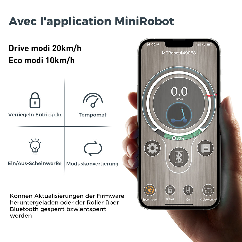 Die MiniRobot-App verbindet sich über Bluetooth mit Ihrem E-Scooter und kann Ihnen dabei helfen, den Elektroroller einfach und vielseitig zu nutzen.